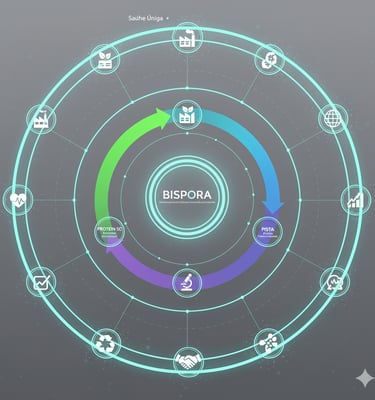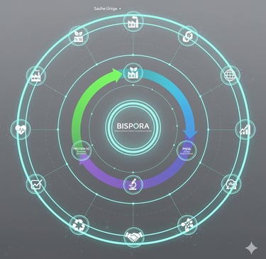 A BISPORA funciona como um ecossistema biotecnológico integrado, baseado no modelo B360, que conecta ciência, tecnologia e sustentabilidade para transformar resíduos em novos recursos de valor.