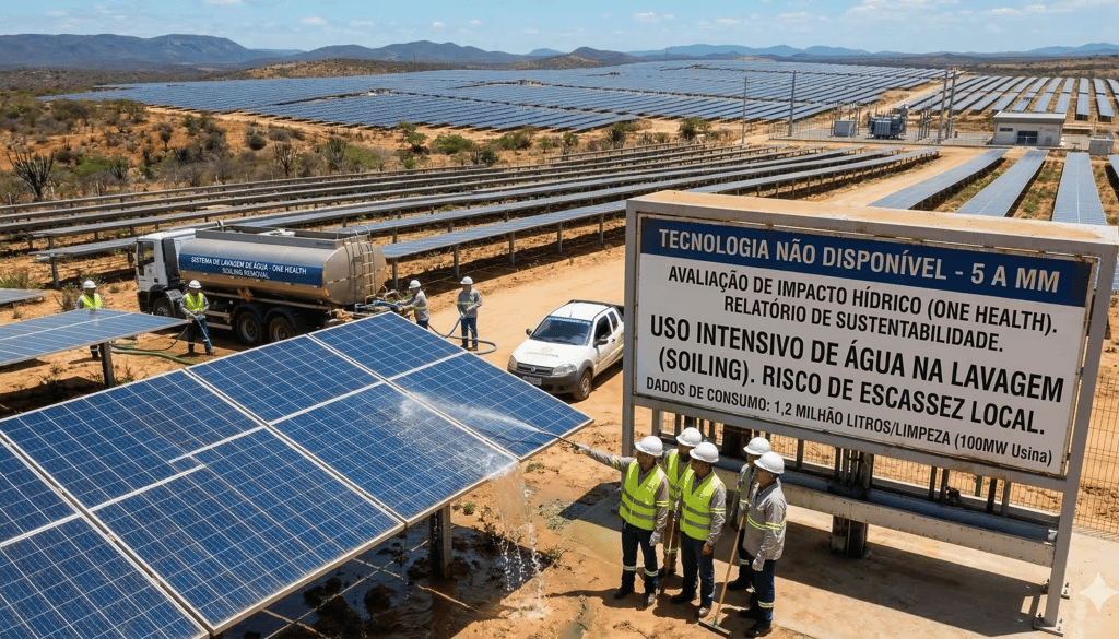 A manutenção tradicional enfrenta o paradoxo da sustentabilidade: o uso massivo de água em regiões de estresse hídrico. Para dar dimensão ao problema, podemos usar as seguintes métricas baseadas em médias de mercado para usinas de grande escala (Utility-scale):