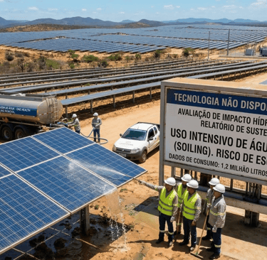 A Escala do Problema: Em uma usina de 100 MW (que possui cerca de 200.000 a 250.000 painéis), uma única rodada de limpeza pode consumir até 1,2 milhão de litros de água.